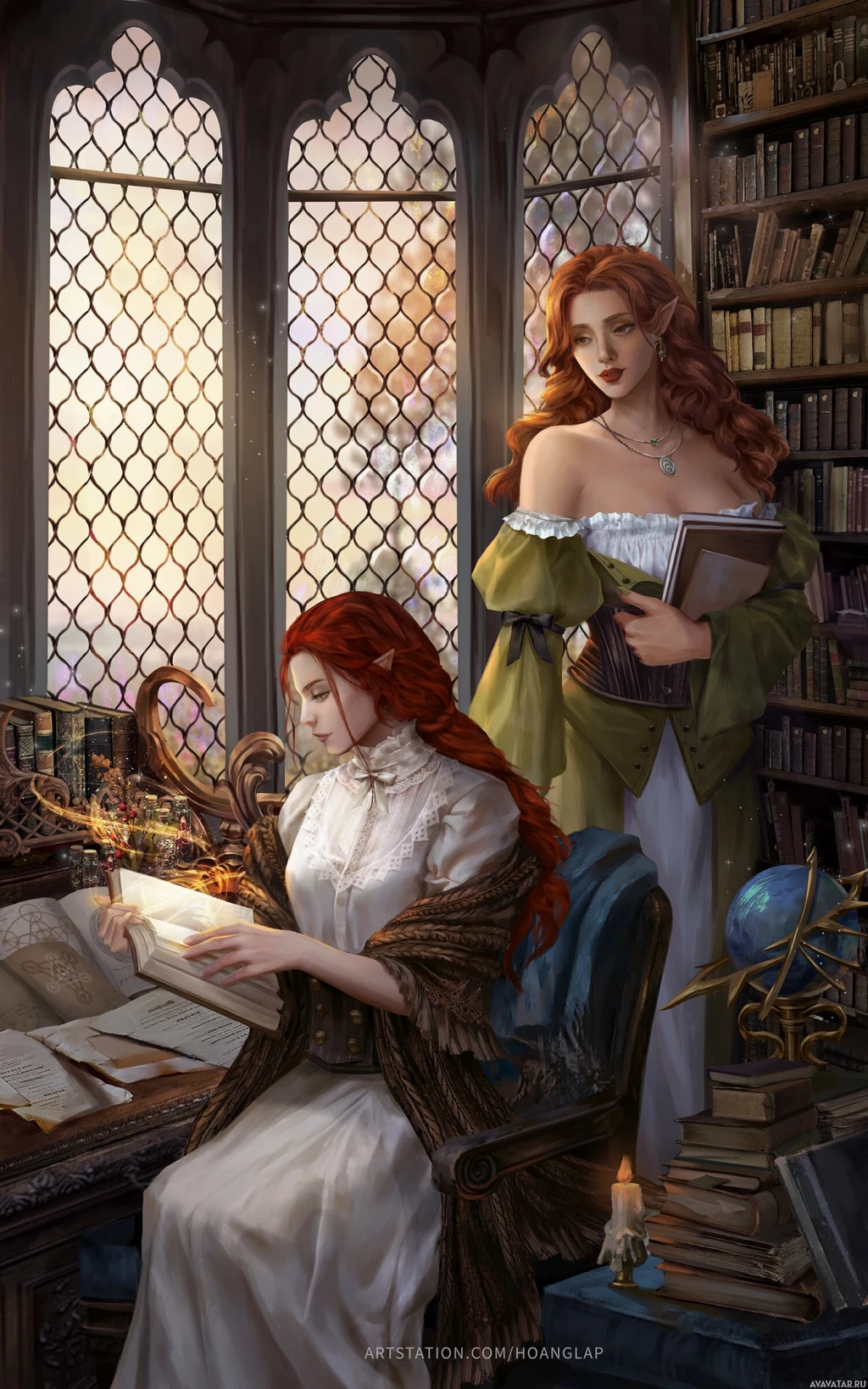 female characters, likely elves based on their ears and other characteristic features. One of the characters is standing and looking down at a book open in front of her, while the other character is sitting and seems to be reading or writing in a journal or a spellbook. The setting appears to be a room that resembles a study or library from an old-fashioned building, possibly a castle or manor house, with