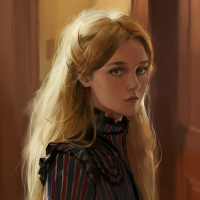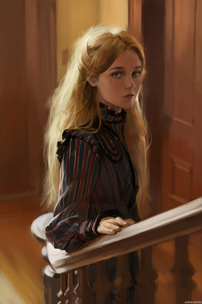 The image depicts a young woman with blonde hair, seated on what appears to be an indoor staircase. She is wearing a patterned dress and seems to be gazing down the hallway or up the steps. There's a hint of a storybook quality to the illustration, suggesting it might be inspired by fantasy literature.