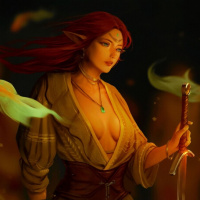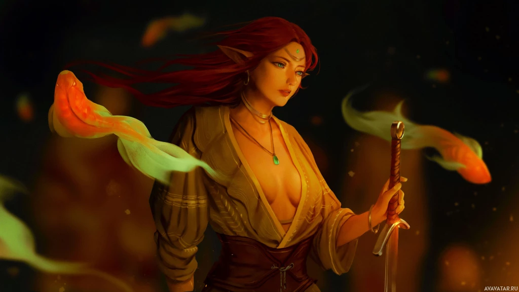 red hair and appears to be an elf due to her pointed ears. She's wearing a yellow or gold-toned armor with what looks like a cape or shawl that is being blown by wind or magical forces to give