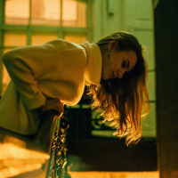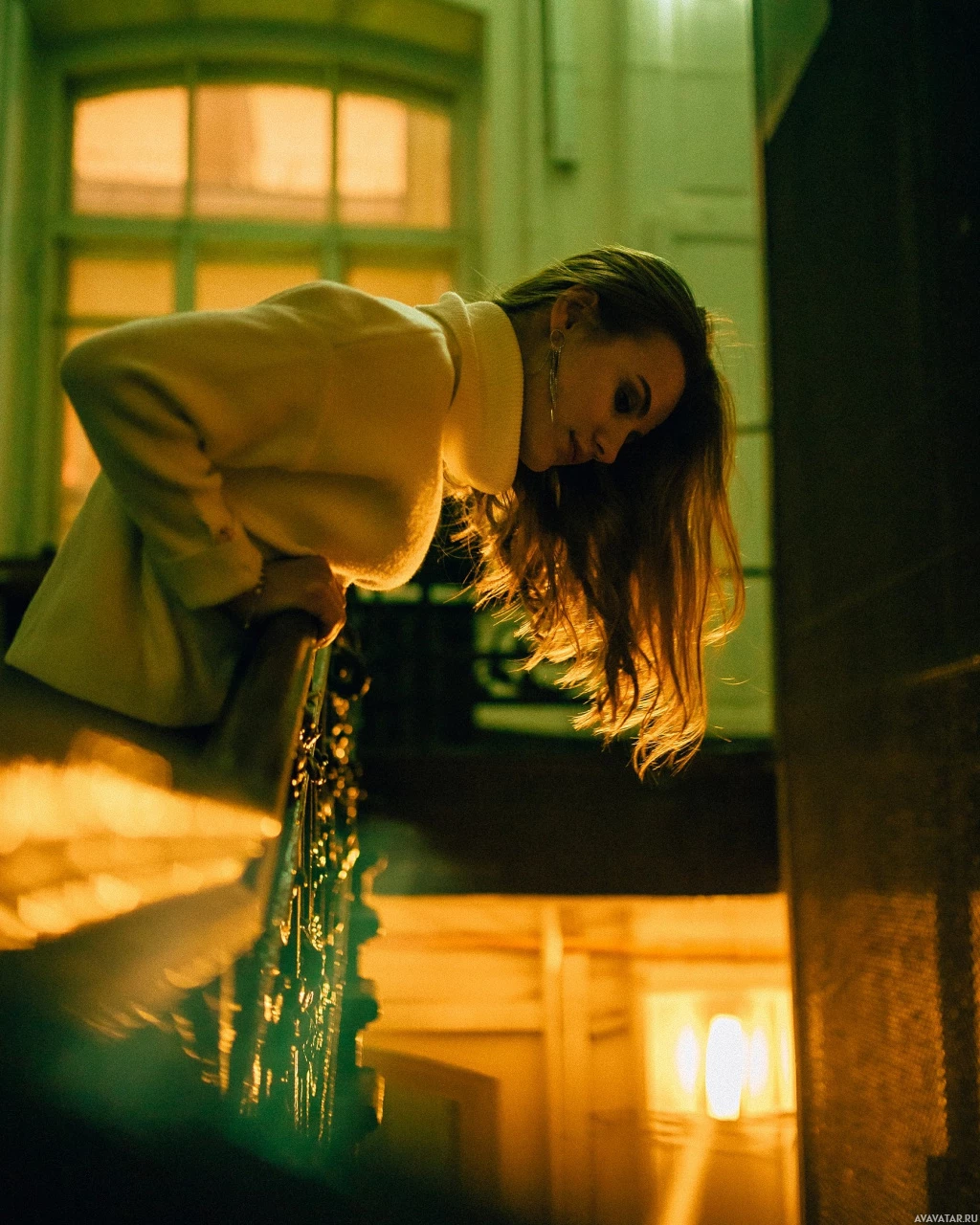 a fur coat, and her hair is flowing slightly in the breeze. Her pose suggests she might be lost in thought or enjoying the ambiance of the location. The lighting creates