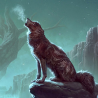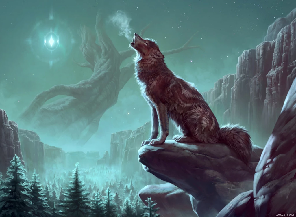 something in the distance, with its ears perked up, which might indicate that it has heard or sensed something in the environment. The overall atmosphere of the picture is serene and somewhat mystical, evoking