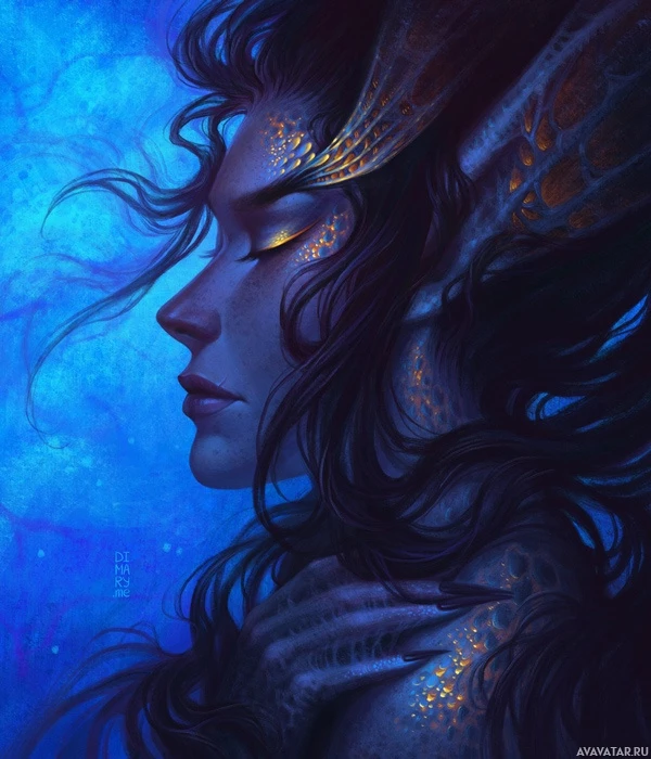a humanoid figure with aquatic qualities, such as gills and scales, suggesting a mermaid or sea creature theme. The artwork is set against