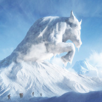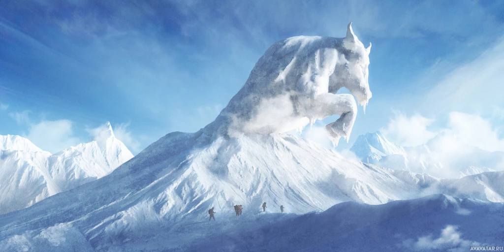 mountainous landscape. In the foreground, there is an ice sculpture of a horse rearing up on its