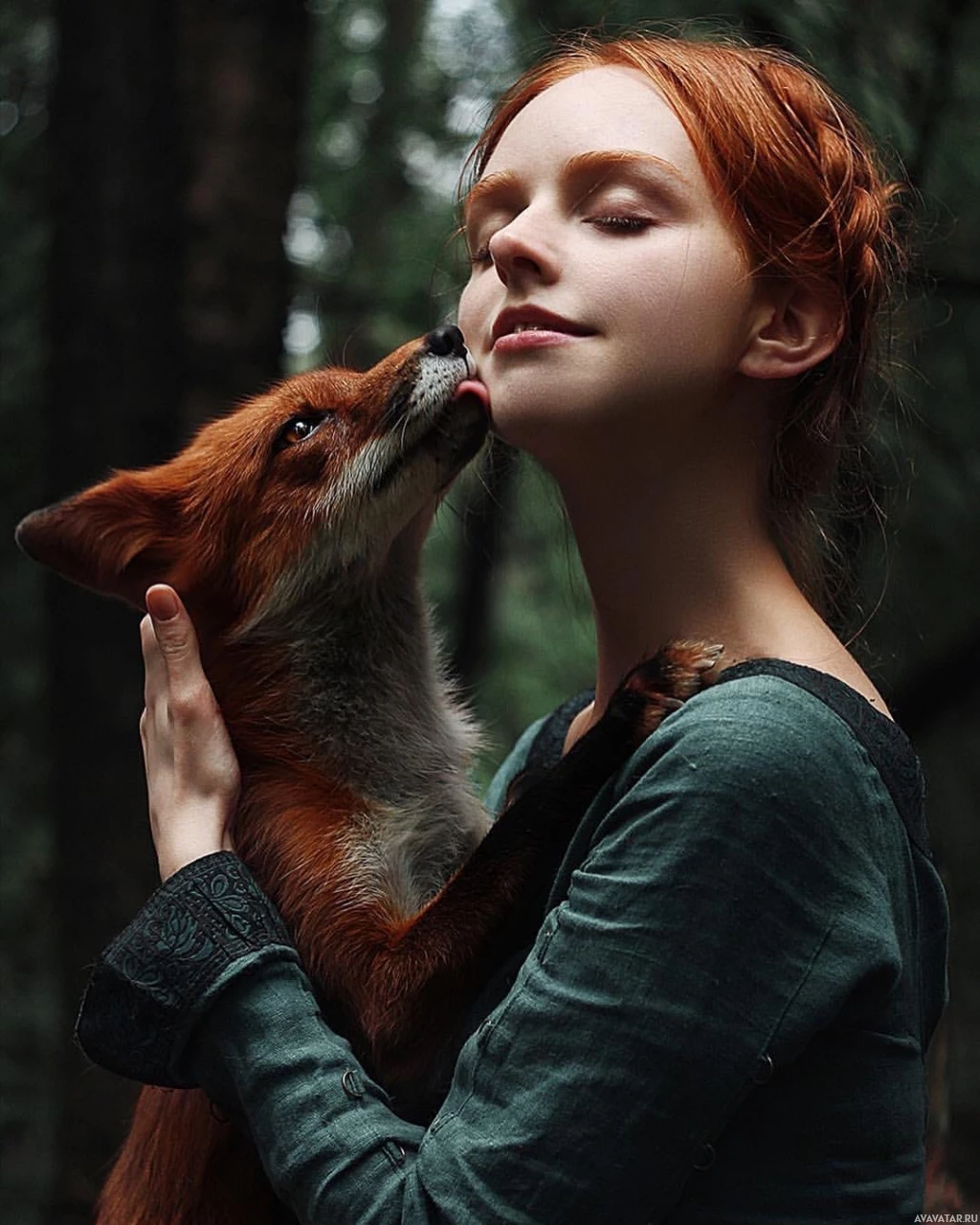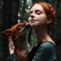 a young woman with red hair, who appears to be in a moment of gentle affection or care. She has closed eyes and seems to be enjoying the interaction with the fox she is holding close. Both are set against