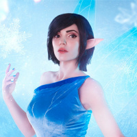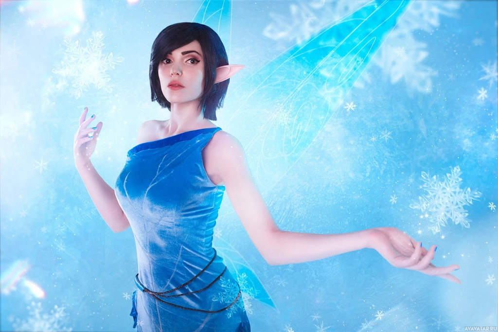 the fantasy genre, specifically resembling an elf or fairy given her pointed ears and ethereal attire. She is holding what seems to be a magical staff with a blue crystal at the top, which could imply she has some kind of