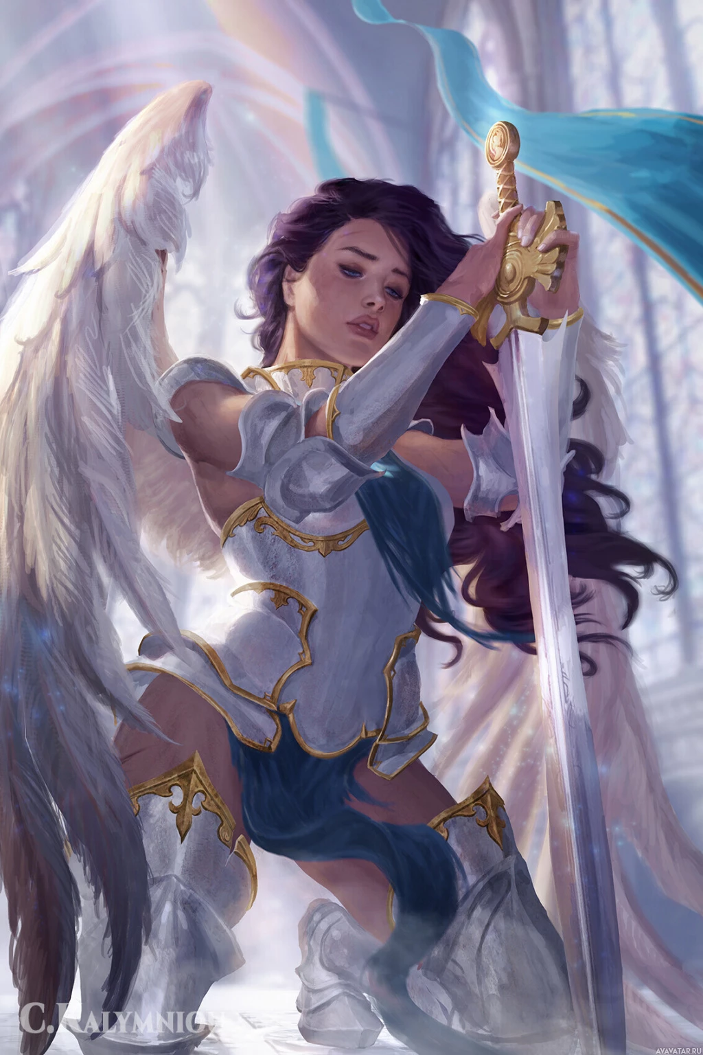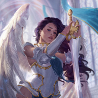 a female character who appears to be an angel or a fantasy figure. She is holding a sword and has wings, which are traditional symbols of angels in
