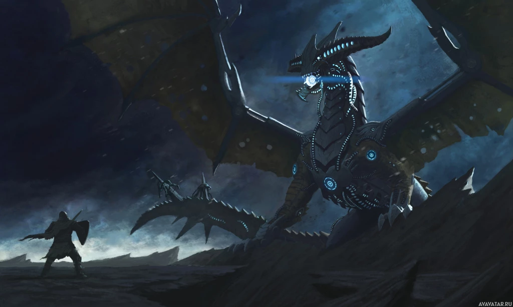 mechanical dragon. The overall atmosphere is dark and ominous, possibly indicating conflict or confrontation between