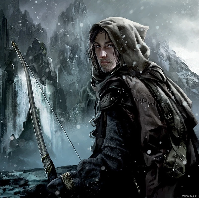 The image shows a character that appears to be from the "Lord of the Rings" universe. This is evidenced by the reference to Middle-earth and the style of clothing, which includes a hooded cloak and leather armor, reminiscent of those worn in the films based on J.R.R. Tolkien's works. The character is holding a bow, suggesting he might be an archer or a warrior of some kind. The background features