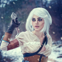 The image features a person dressed in cosplay, portraying the character Ciri from "The Witcher 3: Wild Hunt"