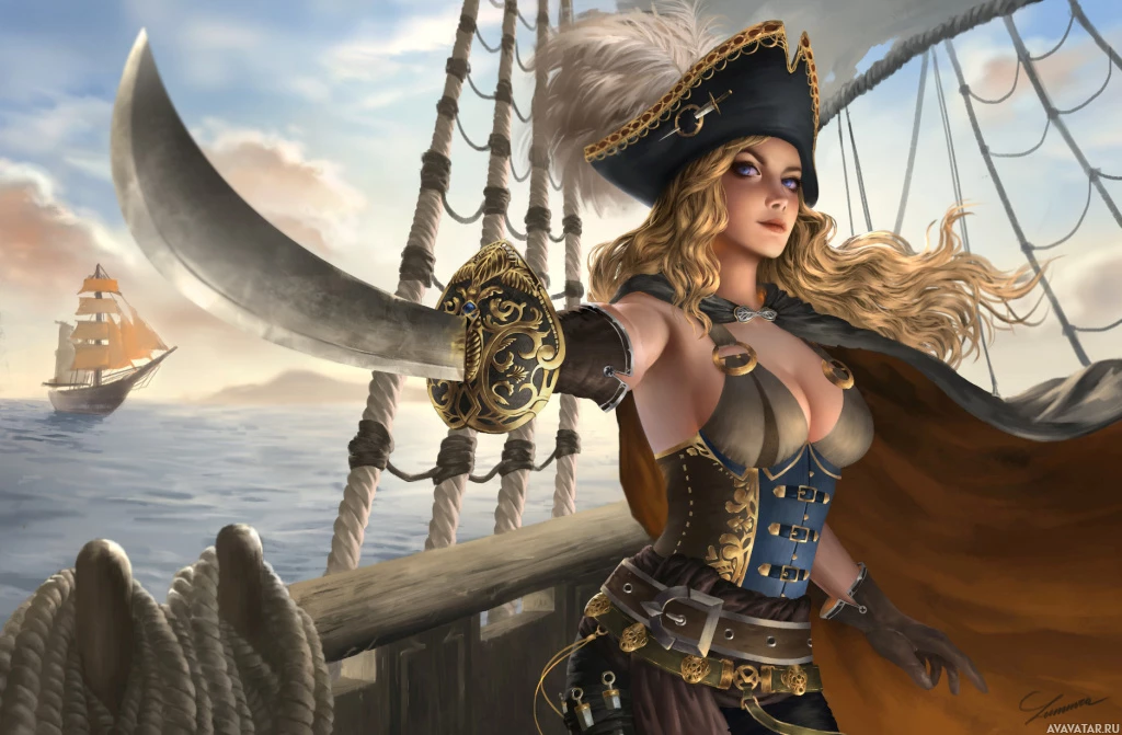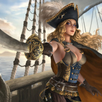 a female character dressed as a pirate. She has long