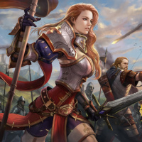 a fantasy warrior character. She is wielding a sword and has her left hand gripping the hilt, while her right hand is holding a shield. Her attire suggests she might be part of a medieval or fantasy army. Behind her are several other characters who appear to be in battle or preparation for combat. The artwork is detailed, showcasing