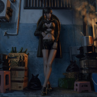 a black outfit with some metallic accents. The overall ambiance suggests a scene that could be from