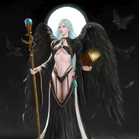 white hair and is dressed in elaborate, dark attire with elements of a traditional robe and wings. In her hands, she holds what appears to be a staff or wand with symbols on it, possibly representing