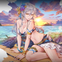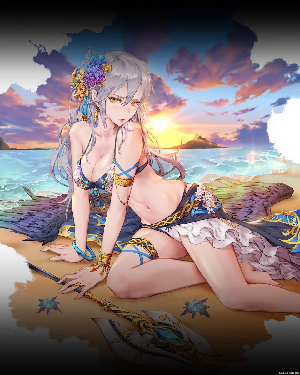 white hair, wearing a fantasy-style costume that appears to be inspired by ancient Egyptian or similar attire. She is depicted sitting on the beach during what seems to be either sunrise or sunset given