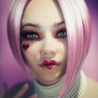 red lipstick, dark eyeshadow around her eyes, and what appears to be a small heart tattoo or marking on the side of her face just below her eye. The character is wearing a high-