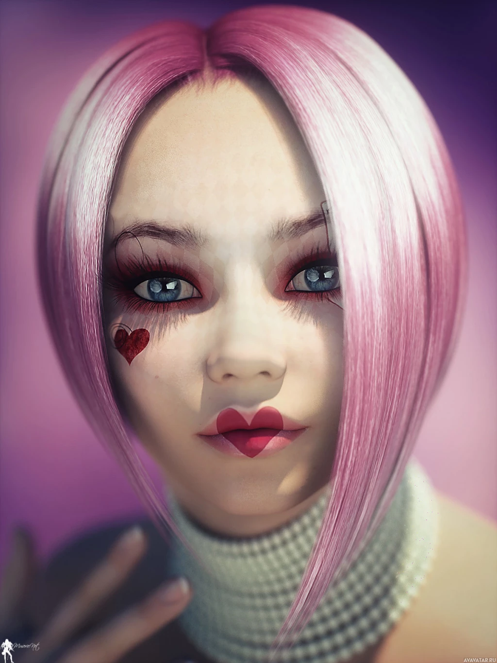 a female character with pink hair and distinctive makeup. She has