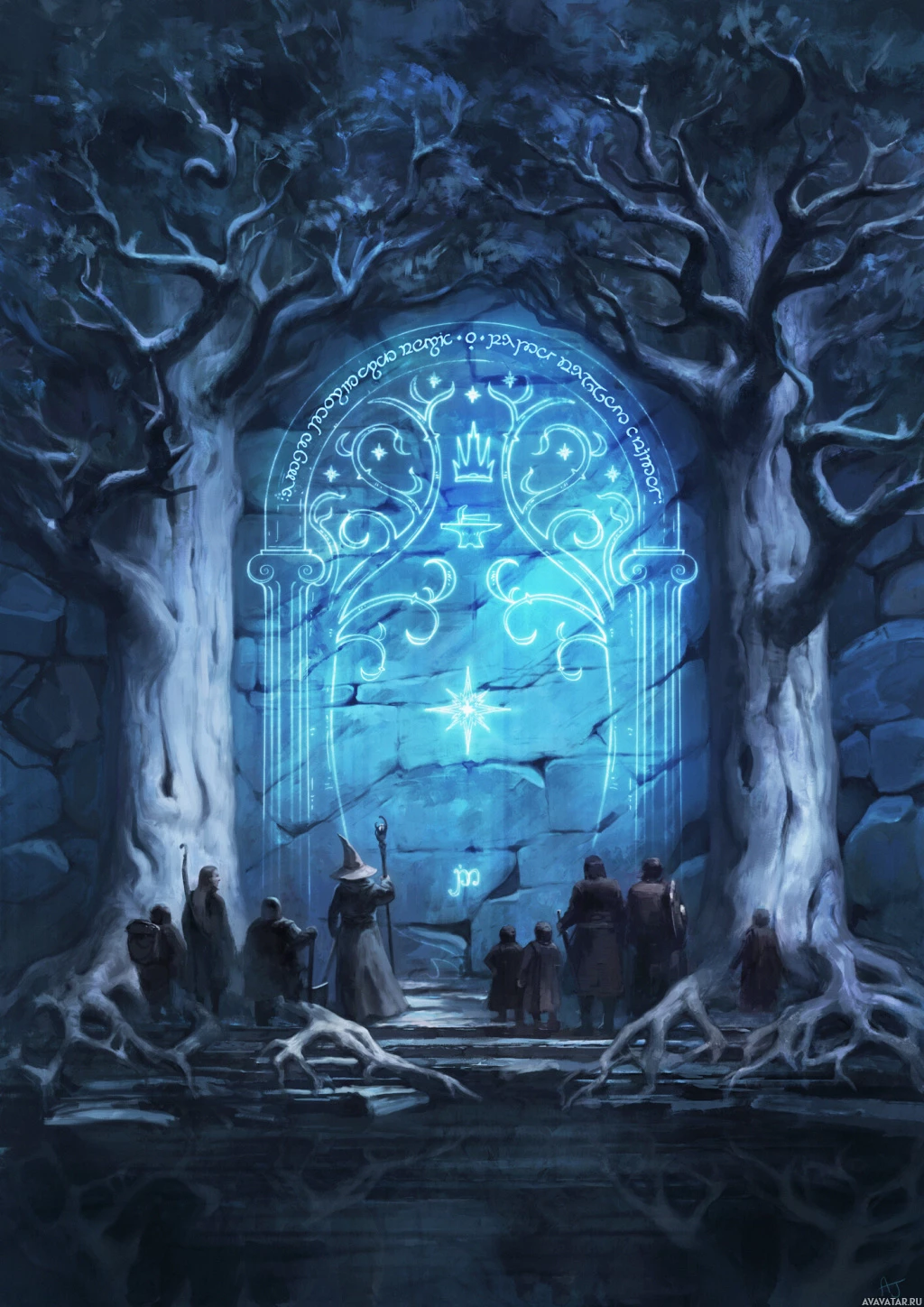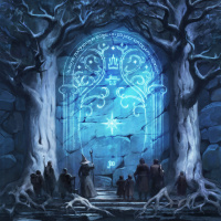 a forest at night, with trees adorned with intricate carvings or runes. At the center of the image, there's an archway that resembles a church door, and behind it, there are figures that seem to be hooded characters, possibly representing Elves or other