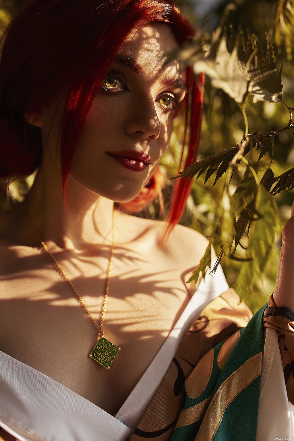 The image depicts a woman with vibrant red hair, wearing a costume that appears to be inspired by the character Triss Merigold from