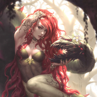 red hair and green body paint, similar to her traditional appearance. She's wearing an outfit that includes a bodysuit, thigh-high boots, and armor with pointed ear-like structures on the shoulders, which are characteristic of Poison Ivy's