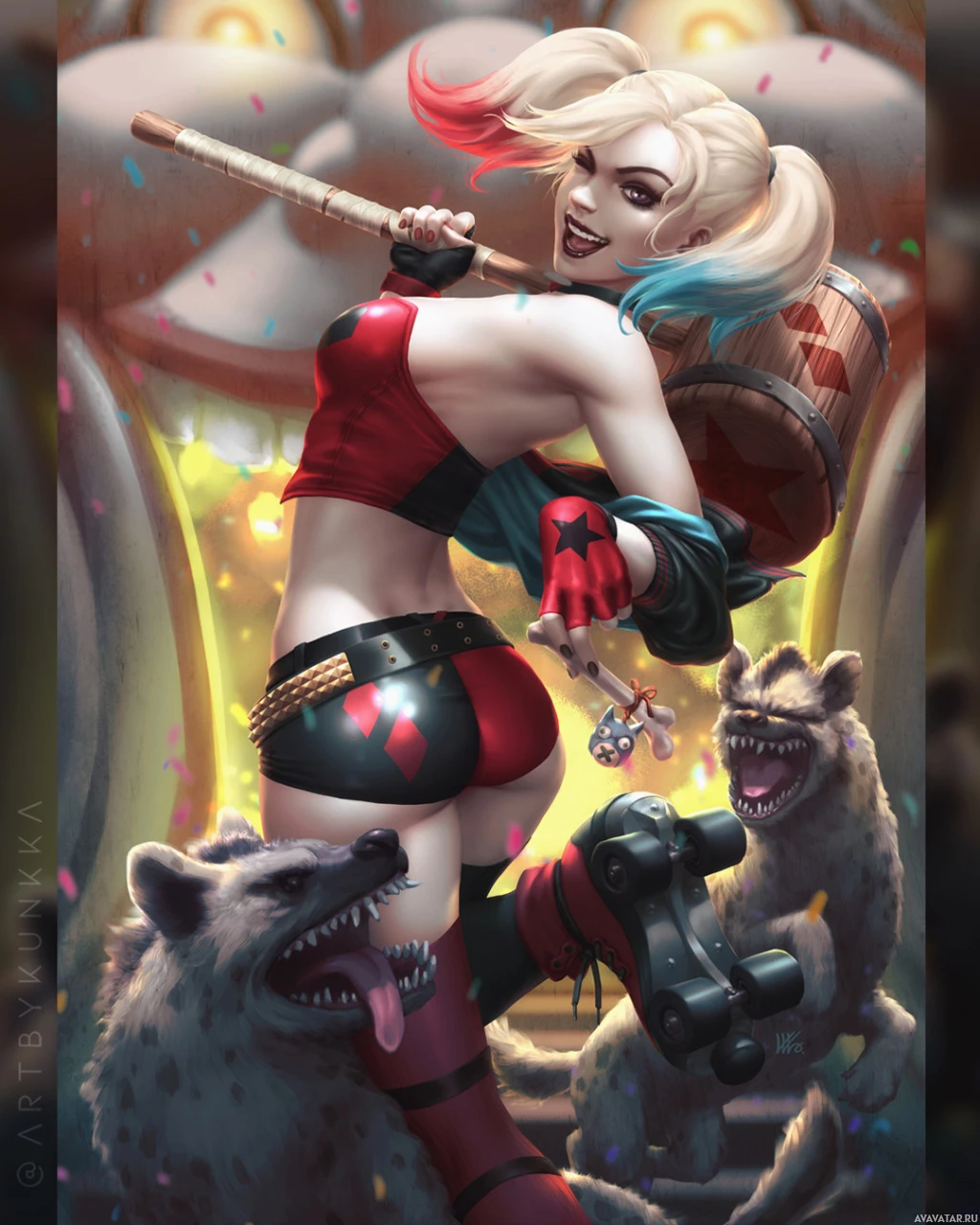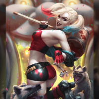Harley Quinn, a well-known villain from the Batman comics and media. She is depicted with her signature look—a short dress, red and black colors, and