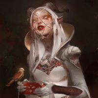 The image depicts a fantasy-themed character with white hair and what appears to be a mystical or otherworldly presence. The character is adorned in elaborate, intricate armor and attire that suggests a blend of medieval and magical elements. They are holding a bird gently, which adds to the enchanting atmosphere of the artwork.