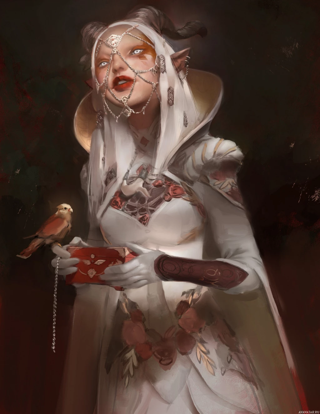 На картинке изображен персонаж в стиле фэнтези с белыми волосами, который, по-видимому, обладает мистическим или потусторонним присутствием. Персонаж одет в тщательно продуманные доспехи и одежду, в которой сочетаются элементы средневековья и магии. Они нежно держат птицу, что создает чарующую атмосферу произведения искусства.