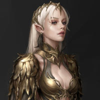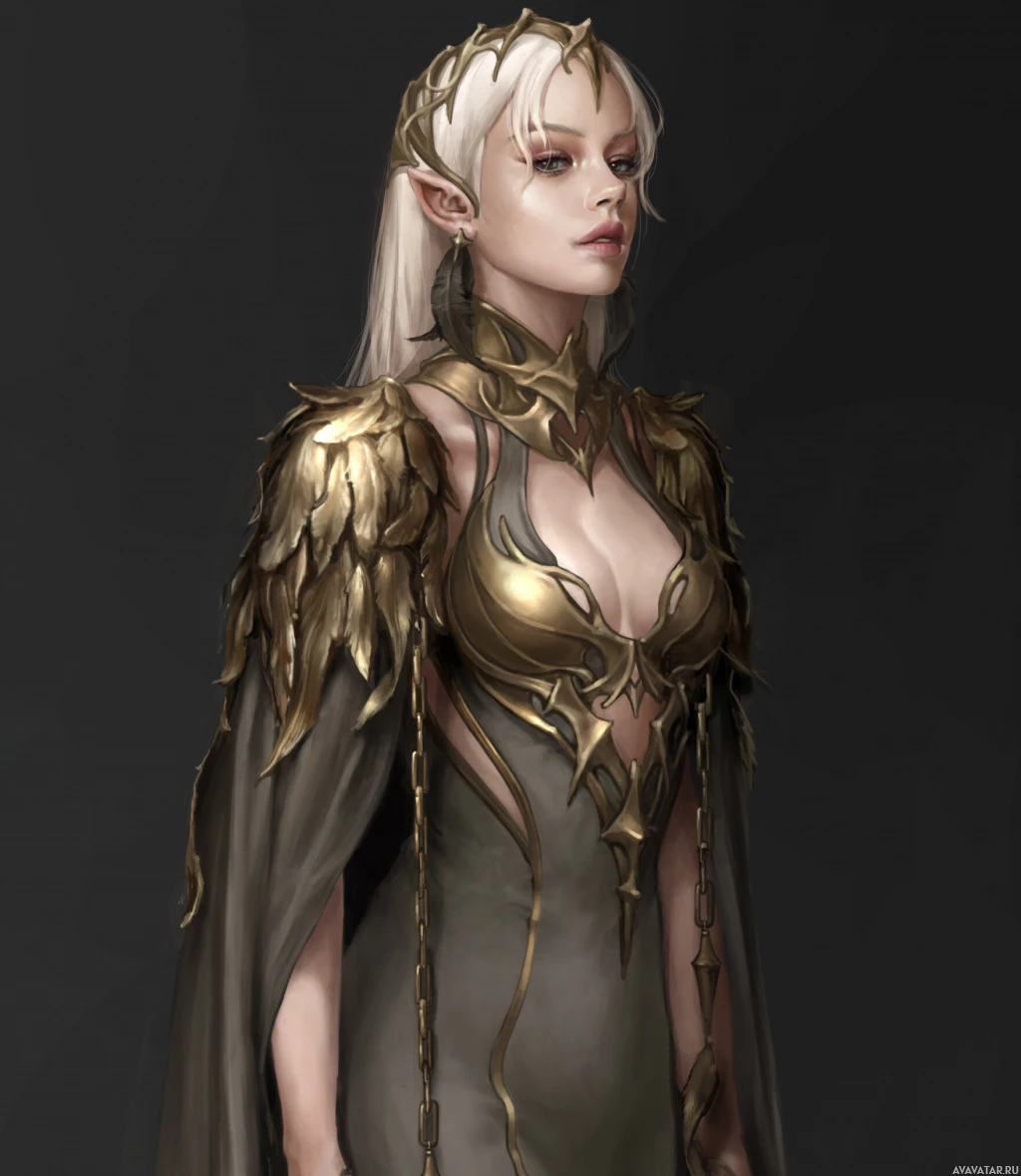 white hair and is wearing an ornate armor with gold accents, giving her a fantasy-themed appearance. She is also adorned with what seems to be a cape or cloak that drapes around her shoulders. The background is