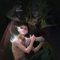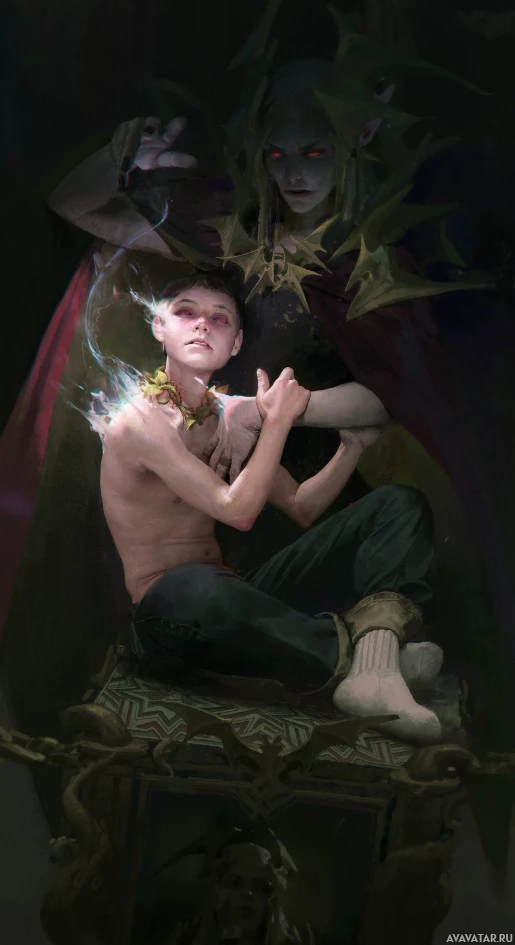 a fantasy scene with a child-like figure seated on a pedestal. There are two figures standing over the child; one seems to have