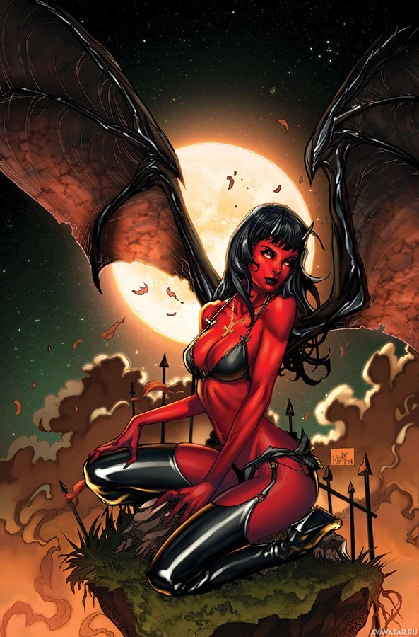 red skin, horns, and wings, which are common traits of demons or supernatural beings. She is sitting on a rocky outcropping at night, with