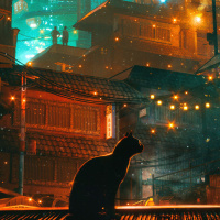 the dark background and the illumination coming from streetlights and building lights. The cat is looking out over the city, which features various buildings and structures that have a futuristic or