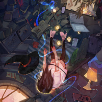 various objects that suggest a magical or chaotic environment, such as books scattered around, a cat with witch-like ears, electronic devices like a computer monitor and a smartphone, and a lamp that seems to be floating in the air above her head. The room has a cluttered appearance, adding to the whimsical