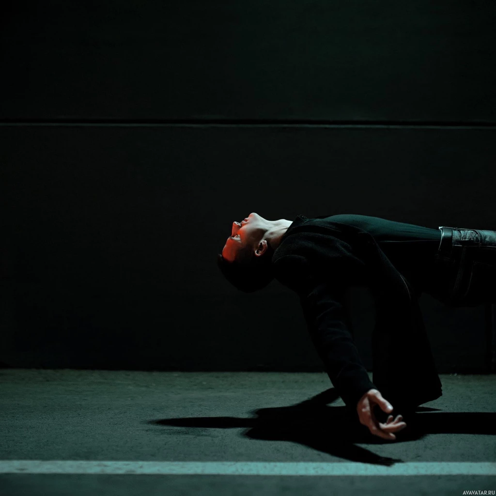 a dark jacket and seems to be in motion, as if they have just fallen or are in the process of falling backward.