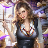 Hogwarts School of Witchcraft and Wizardry, where characters like Hermione are known to study. The background is warmly lit, giving the impression of a cozy,