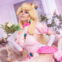 The image features a person dressed in an outfit resembling the character Princess Peach from the "Mario" series of