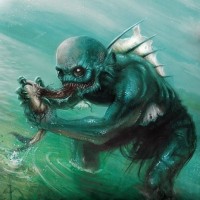 The image depicts a fantasy or horror-themed artwork featuring a creature known as a murloc. This creature is often associated with