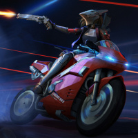 a futuristic motorcycle. The character is wearing