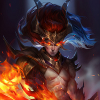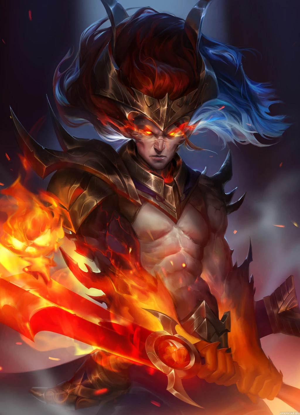 flaming swords or axes. The background suggests a dark or nighttime setting, with embers flying around the character's head, enhancing the intensity of their presence.