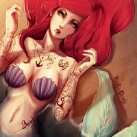 mermaid form. On her skin, there are various tattoos, which is not a feature in the original