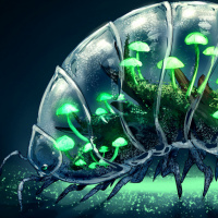 a protective casing. Surrounding the creature is a mushroom-like structure with green moss or foliage growing on it, suggesting a symbiotic relationship between the creature and the surrounding flora. The mushrooms have slender stems and delicate caps that look like they are in good health. The background is dark, which accentuates the creature and the vegetation around it. The lighting appears to be artificial and focused on the creature and the foliage, enhancing their colors and textures. The overall impression is one of a mythical or otherworldly fantasy scene, where such a creature might exist in a realm not of our world but rather one inspired by science fiction or fantasy genres.
