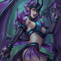purple hair. She is depicted in a fantasy setting with elements such as horns and wings that are characteristic of mythological representations of demons or devils. Her attire includes what appears to be