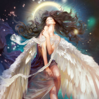 a cosmic background that features stars and nebulas, suggesting a celestial or divine setting. The angel appears to be in a state of