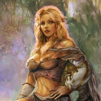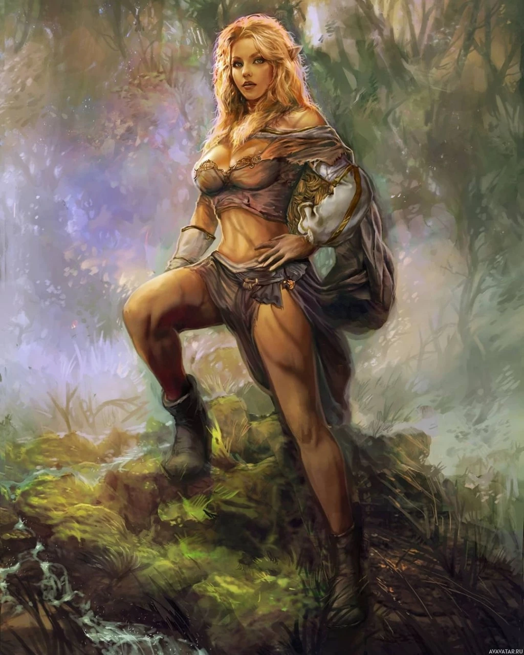 На картинке изображена эльфийка в стиле фэнтези. Эльфийка изображена с человекоподобными чертами лица, в доспехах и со щитом в руках, что наводит на мысль о том, что она может быть воином или каким-то стражем в мире фантазий, в котором она обитает. Она стоит на фоне мистического леса с туманными деревьями, которые придают изображению потустороннюю атмосферу.