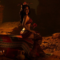 video game. The individual is wearing a costume that includes elements such as horns and tail, which are characteristic of succubus characters in
