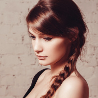 На картинке изображена женщина, которая смотрит вниз, склонив голову набок. У нее заплетены волосы в косу, и она одета во что-то похожее на черный топ или платье. Выражение ее лица несколько задумчивое, и она изображена на нейтральном фоне, состоящем из кирпичей, что может наводить на мысль о городской обстановке.