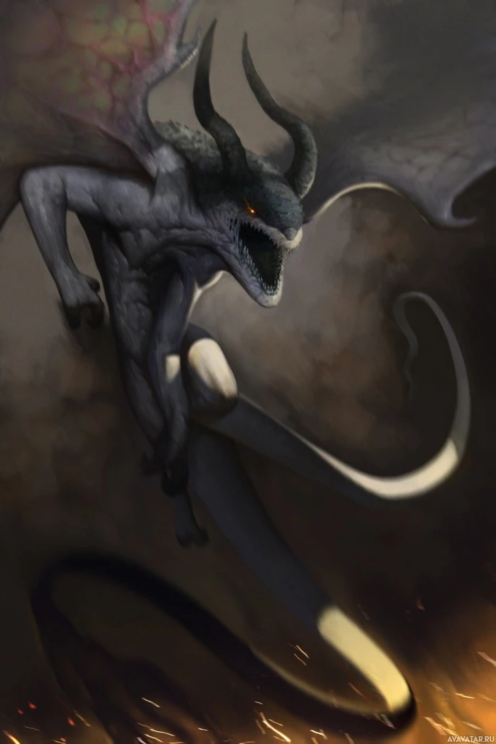 a fantasy scene featuring a dragon, which is a mythical creature typically characterized by wings and the ability to breathe fire. This particular dragon has prominent horns and