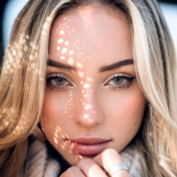 light source illuminating her face from the left side, casting a gentle shadow on her right cheek. She seems to be in a casual setting with