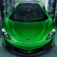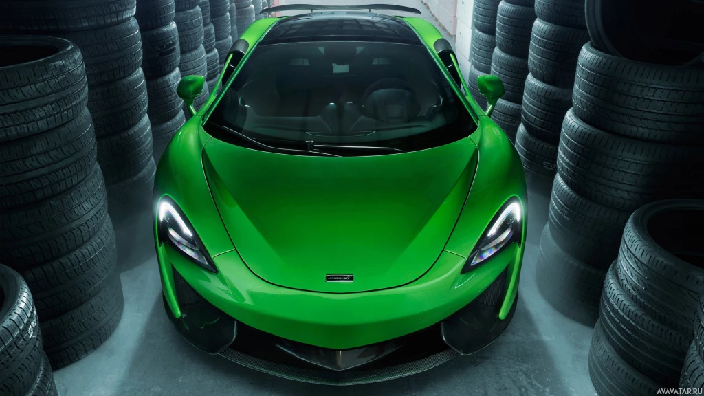 На картинке изображен зеленый спортивный автомобиль, передняя часть которого обращена к зрителю. Позади автомобиля расположены штабеля шин, а обстановка напоминает помещение, похожее на гараж или склад, предназначенный для хранения автомобилей.