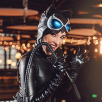 the fictional character Catwoman. The person is also holding what appears to be a batarang, which is