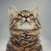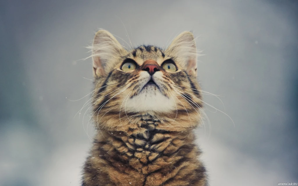The image shows a kitten standing in the snow. The cat appears to be looking towards the camera with its ears pointed up, which is often a sign of curiosity or attentiveness. The background is blurred but gives an impression of
