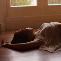 In the image, there is a person lying on their back with their head resting on one arm and the other hand near their forehead. They are wearing what appears to be a light-colored top that is slightly open at the front. The setting seems to be an indoor room with wooden floors and